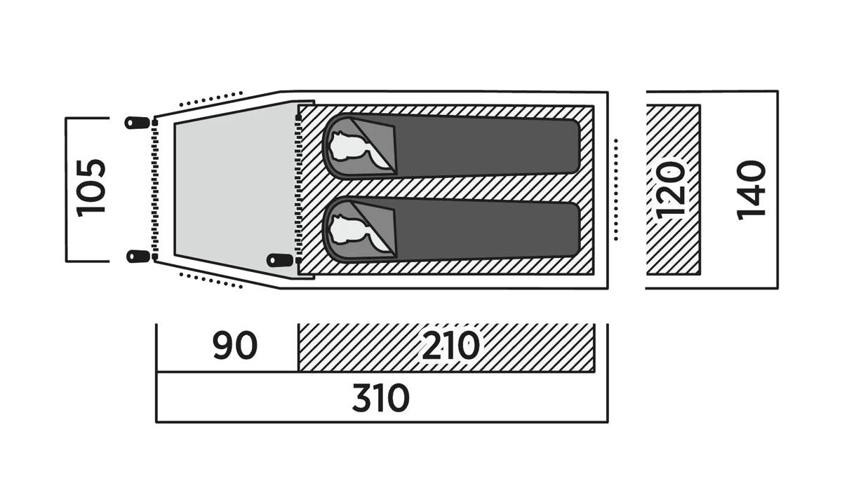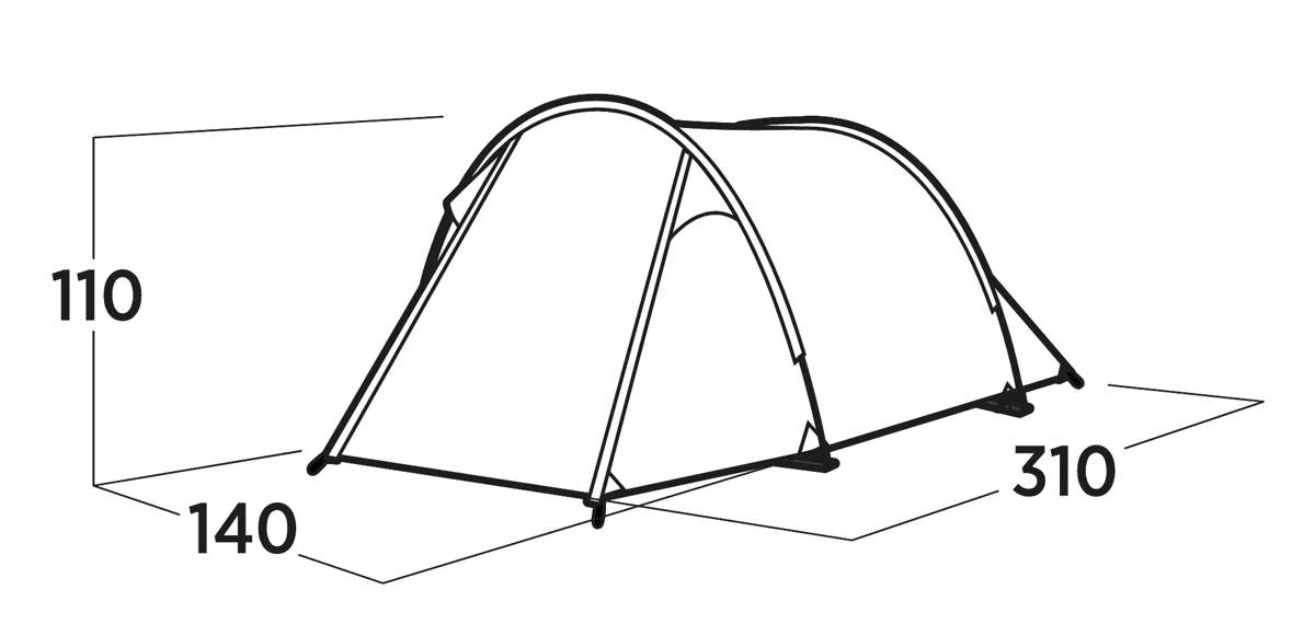 Kompakt 2-personers tunneltält – absid med avtagbar golvduk, ventilationsöppningar fram och bak, fäste för lykta och förvaringsfickor.