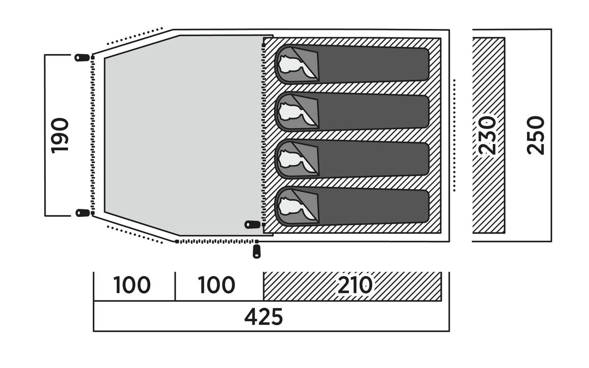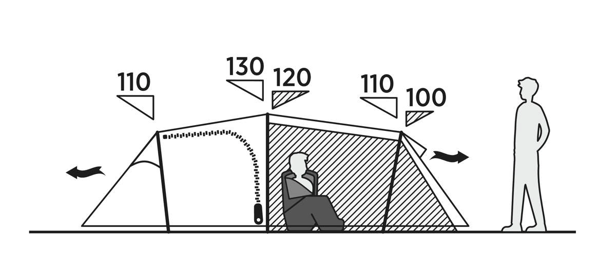 Stort 4-personers tunneltält – stor absid med avtagbar golvduk, två dörrar, ventilationsöppningar fram och bak, fäste för lykta och förvaringsfickor.
