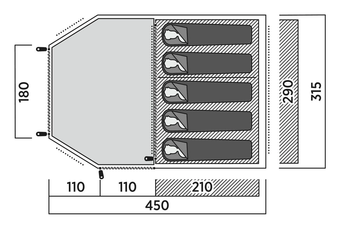 Kompakt tunneltält för 5 personer – Ståhöjd, idealiskt för familjer och vänner. Större förtält med avtagbar golvduk. Förberett för Twinflower Tent Light LED-remsa (säljs separat). Packas kompakt utan golvduk.