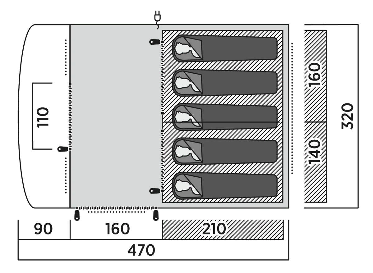 Fullt utrustat tunneltält för 5 personer – perfekt för familjer och vänskapsgrupper. Med skyddad ingång, rymligt vardagsutrymme och 2 sovrum. Klar för Twinflower Tent Light LED-remsa (säljs separat).